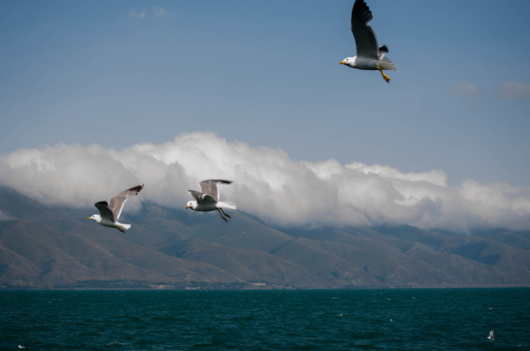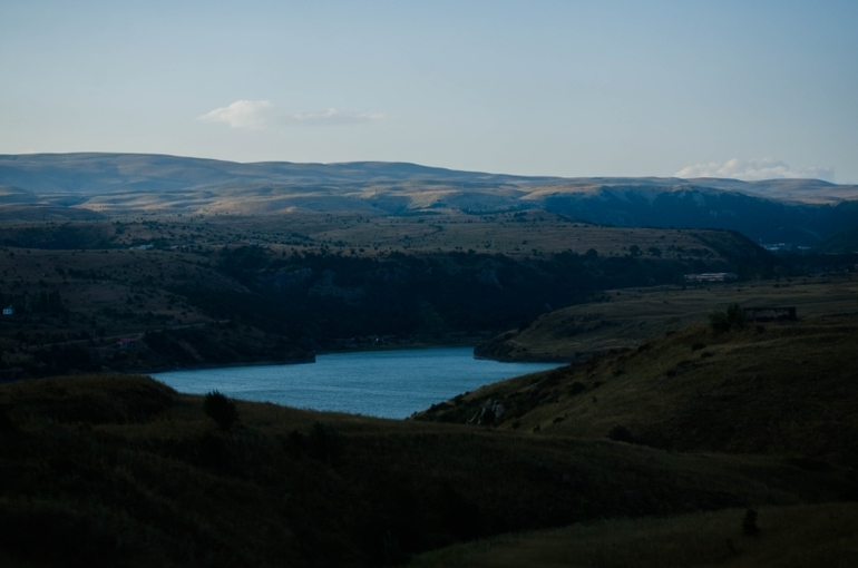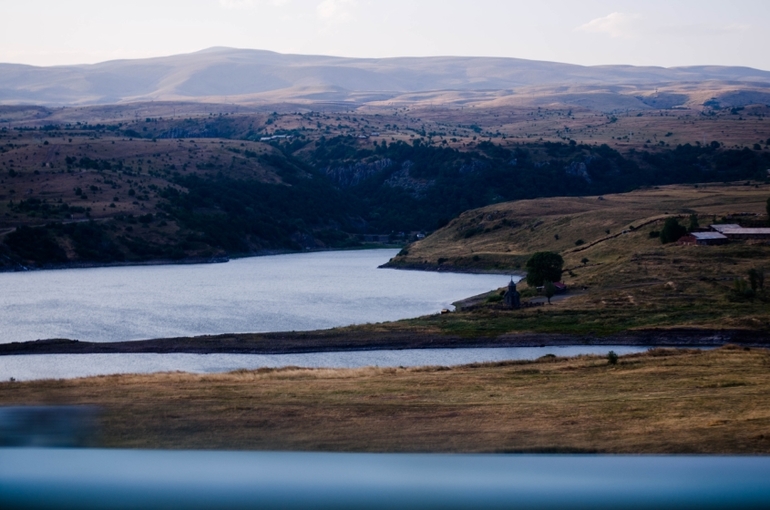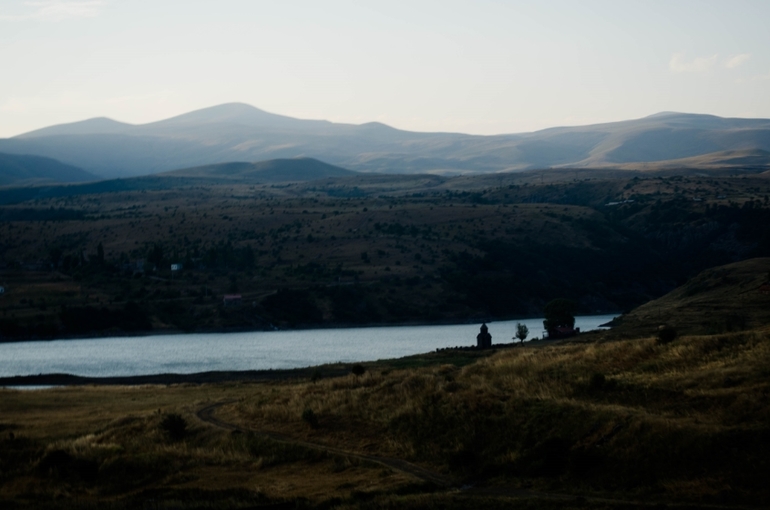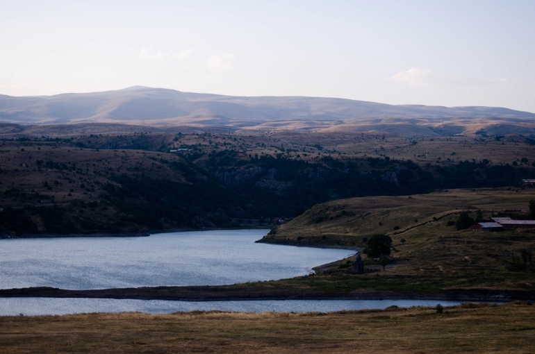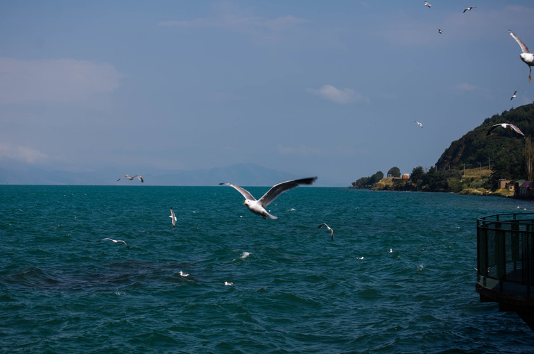 Скалистая местность. Выжженная на солнце трава. Жаркий воздух). Поднимались мы опять очень высоко. Добрались до очень старой церкви. Погуляли там, и поехали на озеро Севан. Озеро меня сразило наповал. Оно необыкновенного цвета. Бирюза... насыщенная и переливающаяся. Огромное озеро, с волнами и чайками. Около него было прохладно, конечно. Чем выше, тем холоднее, а мы находились, как раз очень высоко.