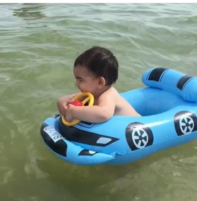 Немного подкачало море. Был шторм. Я хотела, чтоб Гриша, каждый день купался, но из- за больших волн, плавал он два дня всего. Мы ему купили классный надувной автомобиль).