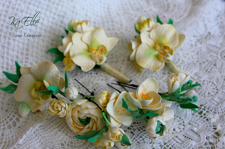 Нежный свадебный комплект из полимерной глины. Шпильки и бутоньерки с цветами фаленопсиса, раннункулюса, туберозы,фрезии,зелень рускус итальянский