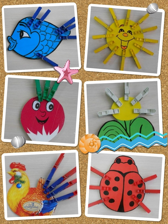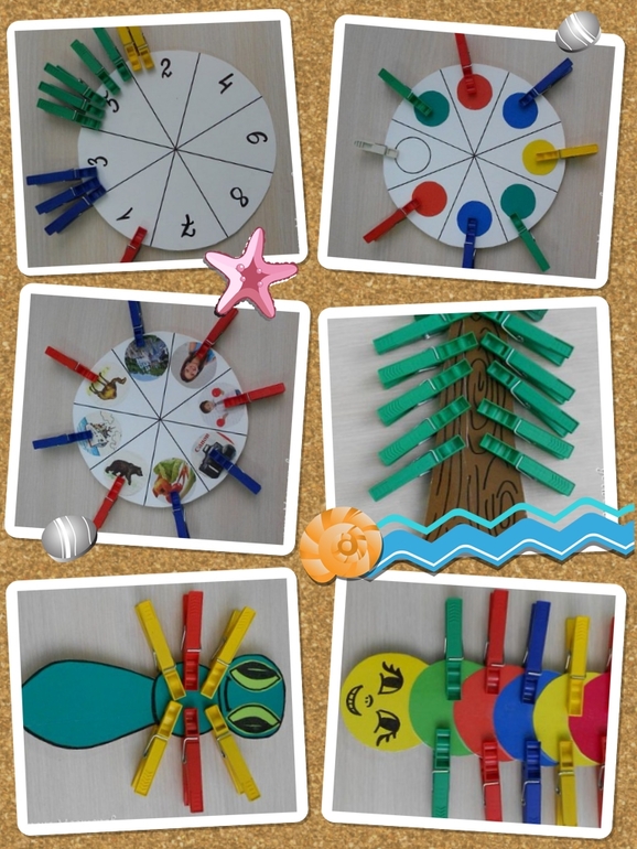 Вот такие игры можно сделать своими руками.Забавные персонажи,овощи и многое другое на что только способна фантазия. Для игр я подпирала прищепки яркие ,а главное со слабым зажимом,что бы детские пальчики могли сами справиться с задачей)).Вариантов игр большое множество....
