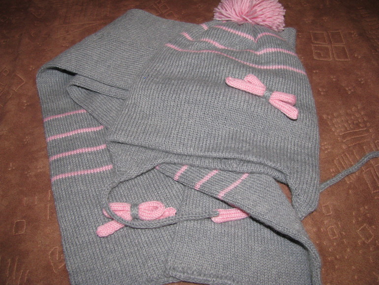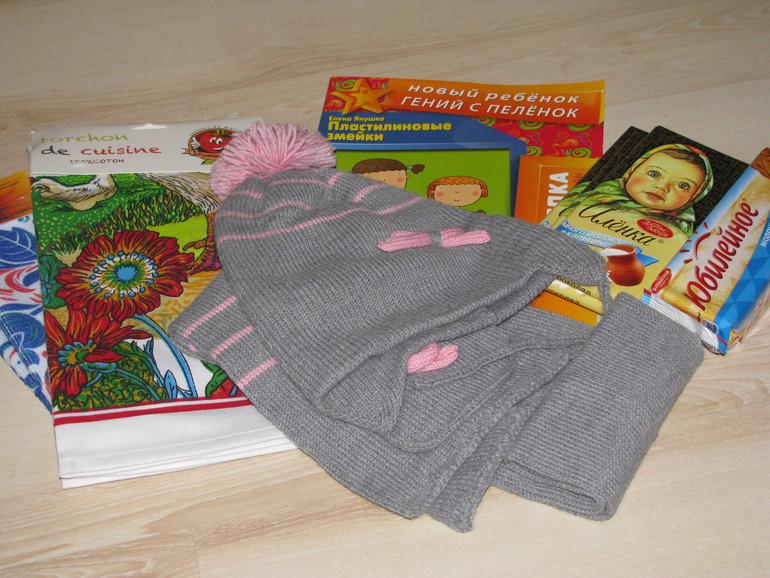 Также состоялся обмен с Еленой. Забрала с почты посылочку, а там: очень красивый вязаный комплект "Бантики" - шапочка с шарфиком, в моем любимом сочетании - серый с розовым. У Елены прекрасные комплекты, глаза разбегаются. И конечно, подарки, много сладостей, ведь и нас много, развивашка дочке, я как раз такими пользуюсь, на 2 года еще не брала, мне хозяйственные нужности. Спасибо большое! Шапочку с шарфиком сразу одели, замотались, покрасовались, жалко, фото на модели не получилось, очень у нас девочка подвижная:)