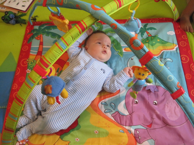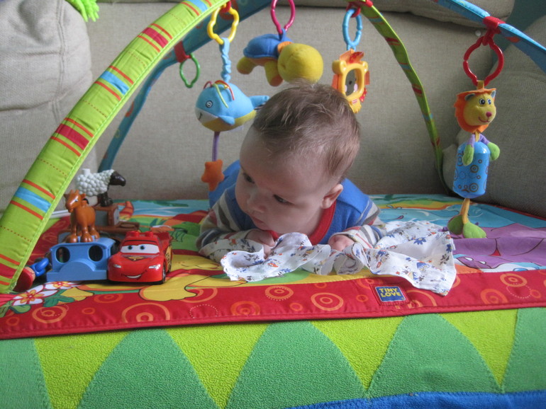 Очень любит за мобилем наблюдать,но ещё больше за Баженом)))))),а ещё очень на коврике нравится лежать,ручками задевает игрушки,пытается схватить.
