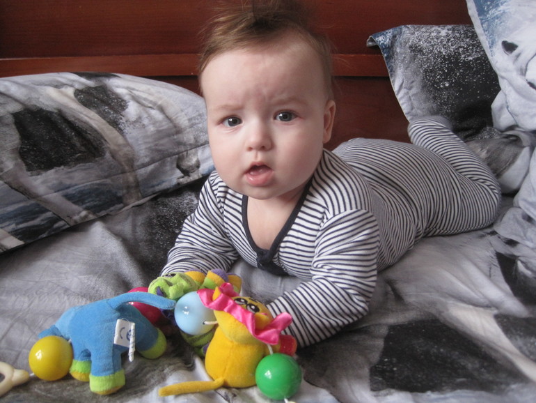 Перевернулся наш мальчишка!!!!!!!!Получилось!!!!!Ох,как же он старался,как психовал,особенно последнюю неделю))))))Он ведь у нас крупныш))))И вот ,вчера,приходит папа с работы и кричит из спальни,что перевернулся наш могучий медведь,я конечно не поверила))))Встали все над малышом и ждём,а он кувырк,и готово))))))))))Бажен даже захлопал))))и всем теперь расказывает с гордостью про брата)))