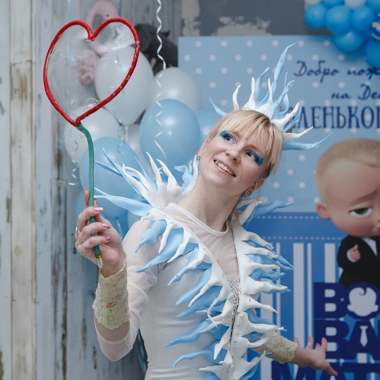 тематическое авторское шоу мыльных пузырей с уникальным реквизитом в танце, в шоу участвуют около 20 различных ракеток в том числе и уникальные, дым огонь пена погружение ручные трюки погружение, все шоу проходит в танце под специальную музыкальную композицию где каждая ракетка и трюк работают под свою музыку. Всё шоу включая реквизит и музыкальную композицию в зимней или цветочной стилистике. Около 30 различных костюмов и образов, один из которых единственный в мире. Длительность и наполнения можно корректировать под мероприятие. В шоу можно добавить :светящийся столик и/или неоновый свет