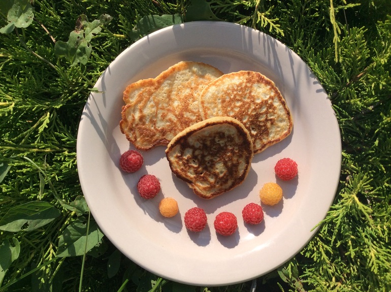 Давно не писала, потому что особо на даче в жару и без духовки ничего готовить и не хочется)) но как же не приготовить оладушки и не съесть их со свежими ягодками?