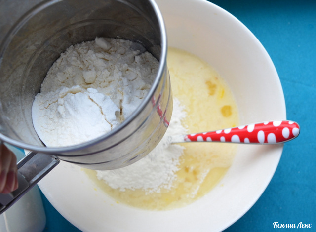 № 5. Просеиваем муку (добавляем муку, пока тесто не станет похоже на очень жидкую сметану). Добавляем разрыхлитель, ванильный сахар.