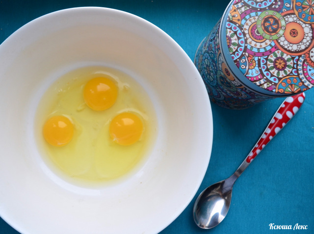 № 1. В глубокую миску разбиваем 3 яйца.