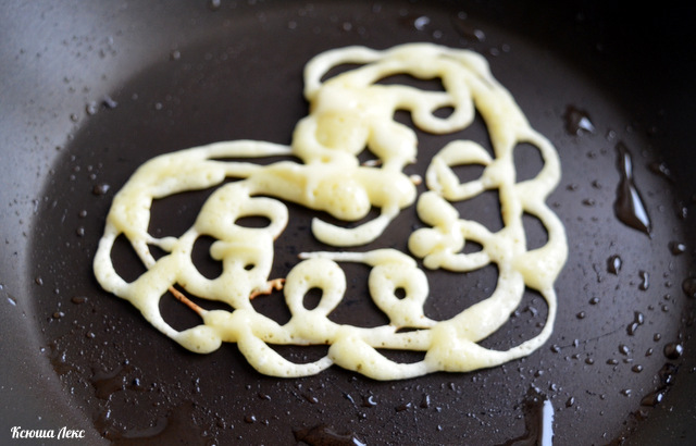 Для того, что испечь блины в форме сердца без помощи кулинарных "гаджетов", нужно нарисовать контур сердца на сковородке, с помощью бутылочки с дозатором (или кулинарного шприца, как у меня) , а потом равномерно, по часовой стрелке (или как получится:)), выводить линии, пока все пространство не закрасится тестом.