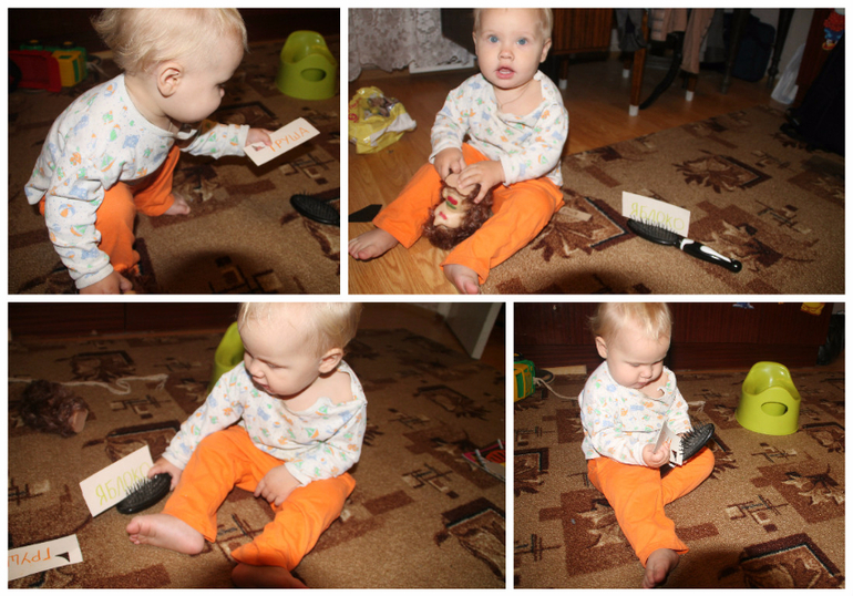Небольшие словечки появляются, но медленно. "Ахххх" = цветы, "ах как красиво!"; изображает звук трамвая и паровоза - тысь, тысь (точнее, тъсь, тъсь). Много обезьянничает, иногда пробует "на язык" новые слова, пытается повторить. Но пока активно использует очень немного. "Любимые" согласные - по-прежнему "д" и "т", гласная - "а", поэтому все новые "слова" звучат как дада, тата, дядя, тятя и т. п...