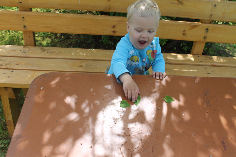 На прогулках всё так же настороженно относится к детям на площадке, если возможно, старается избегать Если невозможно - максимально сепарируется. Очень интересуют его старшие ребята - лет с десяти, к ним присматривается, улыбается, начинает играть в ку-ку и стесняться. Зато виснет на бабушках и дедушках - готов забраться на колени к каждой мельком взглянувшей на него старушке. Особенно если у той есть палка :-)