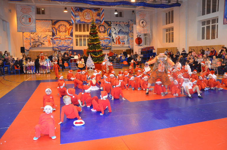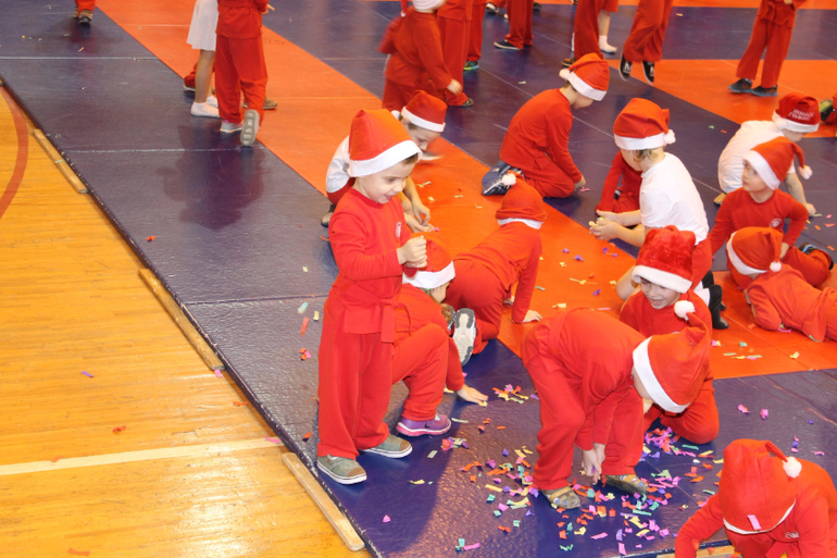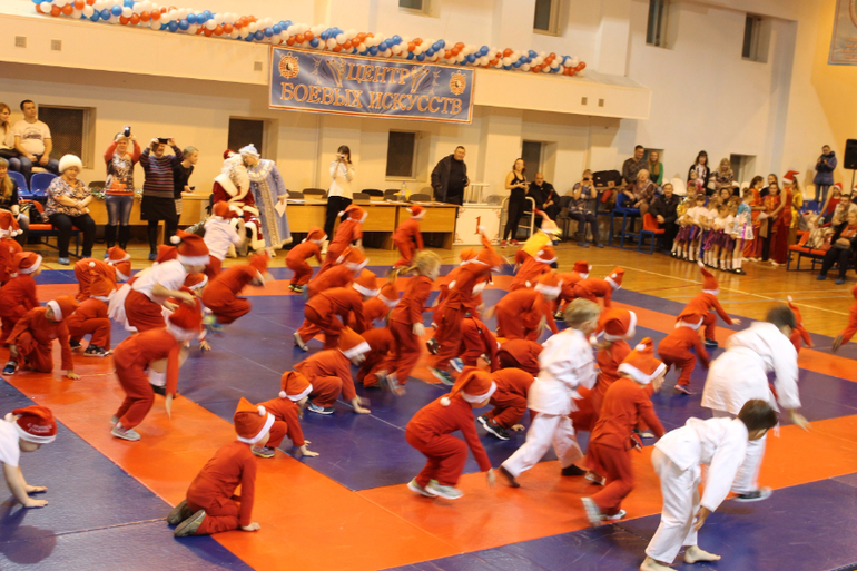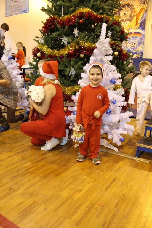 И вот... день настал. Точнее, вечер, 21 декабря.Митю оставили бабушке (был порыв взять его с собой, но по зрелом размышлении прошёл, и правильно, что не взяли). Переоделись, вошли в зал, еле-еле нашли свободное место. Ёлка была не общая, а именно для групп малышей 3-5 лет. Все в красном, в красных же шапочках... Вот таких вот гномиков набралось человек 50-60 (из нескольких филиалов центра боевых искусств).