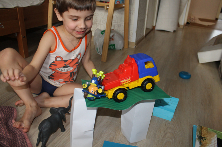 Митя иногда конструирует из бумаги: нарежет деталей, потом склеивает полоски и квадратики в "экскаваторы" и "внедорожники".