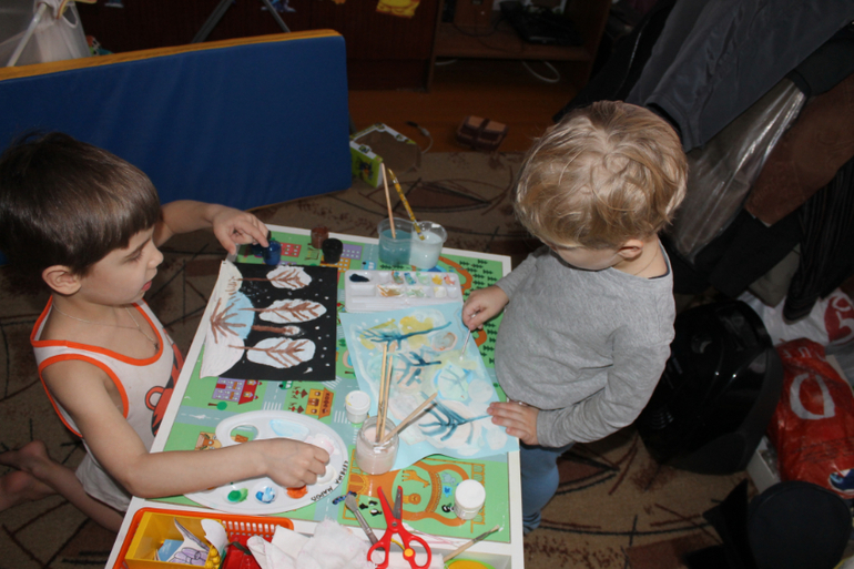 Вот, рисуют зиму: у Мити измазан уже второй лист, Серёжа пересчитывает сугробы и выверяет соотношение тонов...