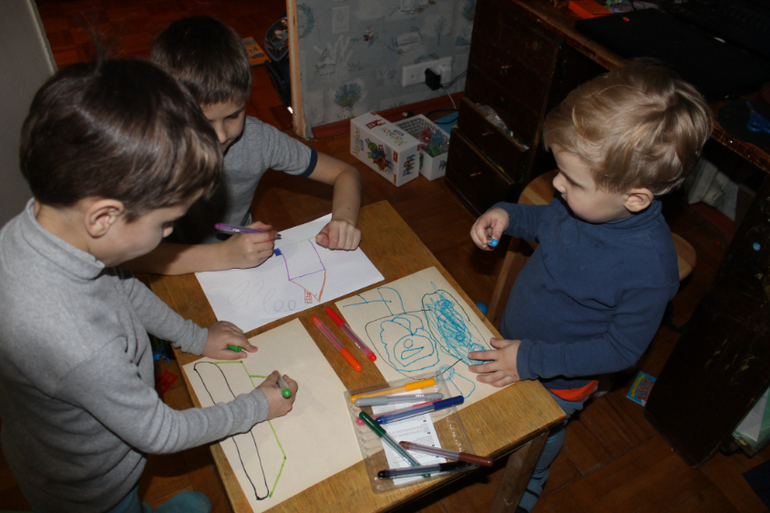 Отношение к творчеству тоже очень разное. Когда в Питере были, рисовали вслед за двоюродным братом пряничный домик. Даня чем-то недоволен: "Папа, у меня тут плохо получается!", Серёжа рисует, но потом в какой-то момент отбрасывает лист в сторону: "Не получилось! Надо снова!" и только Митя остался полностью удовлетворён своим творчеством: