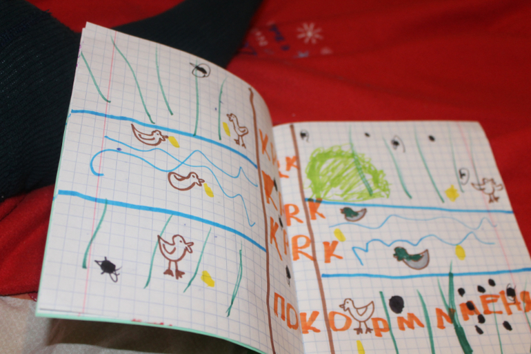Утки, которых Серёжа сначала не хотел рисовать, но потом разошёлся и принёс мне этот лист со словами: "Оказывается, умею. А сам говорил: "Не умею", вон зато какие хорошие получились!"