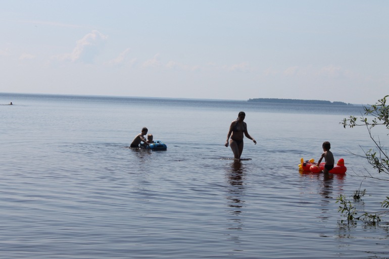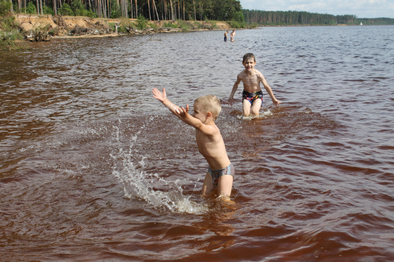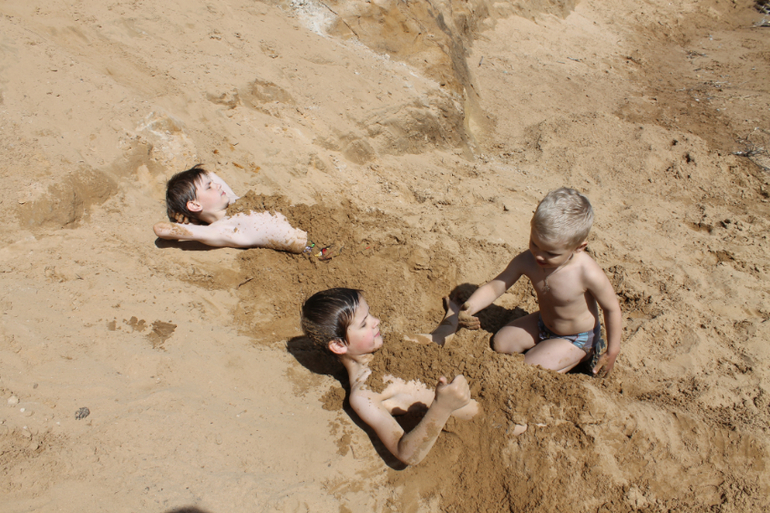 В некупальную погоду дети ходили на другой "пляж" - то есть то место, где подсыпан шлак. Бросали камешки и строили мосты. Зачем мост? Чтобы добраться от нас до того "необитаемого острова" - и Серёжа показывал на какой-то островок вдалеке. Опять же поражаюсь разнице в темпераментах. Митя загорался Серёжиной идеей о мосте до "никитайного острова", по-быстрому собрал кучу из камней, под конец свалив всю работу на меня ("Мама, мне нужен этот большой камень. И этот. И этот. Теперь поставь, чтобы трещин между ними не было. Нет, не так." - "А строй-ка ты, голубчик, сам!") Серёжа за это время поставил только три камня один к другому, стараясь подогнать их так, чтобы между ними не было зазоров. Отходил, смотрел на "мост" издалека, потом испытывал на прочность ногами, не шатается ли, выбирал тщательно следующий камень и - "Мама, отойди, ты не знаешь, какие мне нужны!" Потом Серёжа придумал: "Я построю этот мост до середины, иначе камней не хватит, а потом там поставлю пружину, и люди, которые хотят добраться до острова, будут наступать на эту пружину, и их туда перебросит".