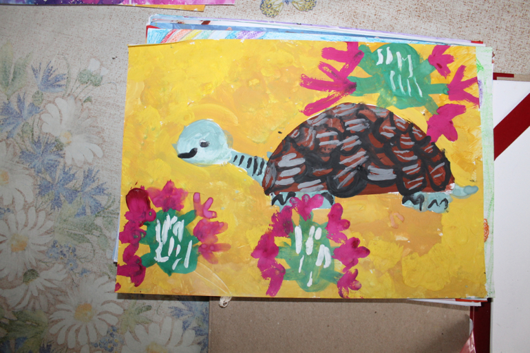 Черепаха и самому понравилась, потом дома пытался повторить и Митю учил... Где-то среди рисунков затерялись, не отфотографировала сразу.