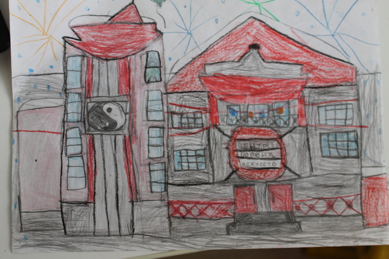 А это самостоятельный рисунок на тему "Центр боевых искусств в Новый год". Был такой конкурс, но Серёга на него не успел, просто так рисунок остался на память. Рисовал с фотографии и по памяти. Помогла только надпись маленькими буквами написать.