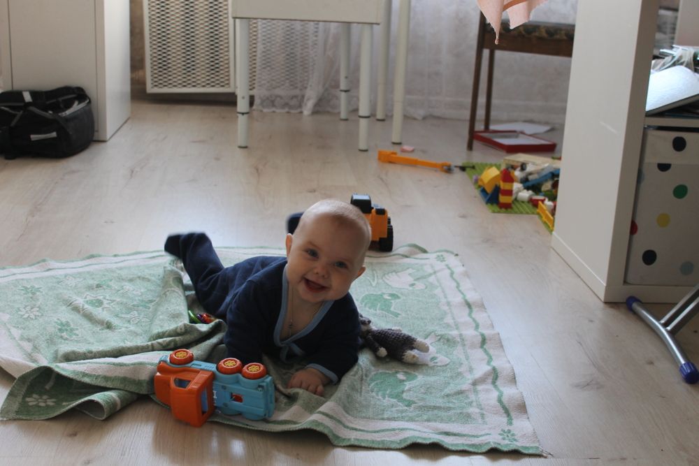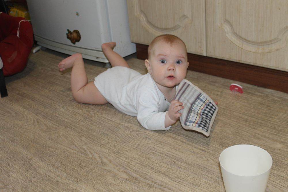 Вертится активно, несколько дней назад на секундочку стала вставать на четвереньки - перед броском на понравившуюся игрушку. Способ перемещения такой: четвереньки - потом одна нога вытягивается назад, упор на пальцы стопы, вторая нога или остаётся на колене или тоже уводится назад на пальцы, потом из этого упора толчок обеими ногами, от пола отрываются руки - и летит наша лягушатина носом вперёд.