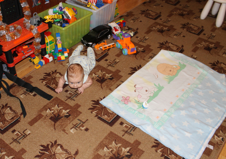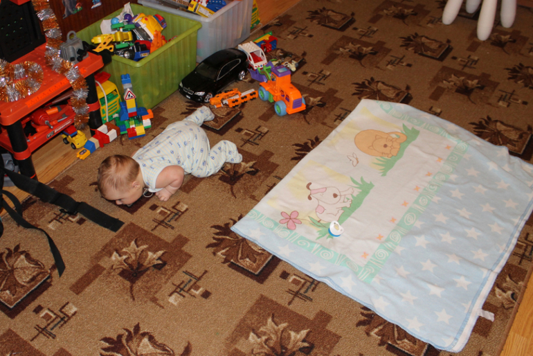 Оставила на две минутки на одеяле. Прихожу - а он эвона где!