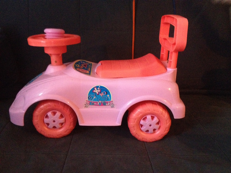 3. Машинка каталка ходунки с багажником, трещина на руле, ремонтируется путем обвязки обычной изолентой (благо ее сейчас можно найти любого цвета за копейки), неубиваемая, подойдет для дома и улицы - цена новой примерно от 1000 рублей