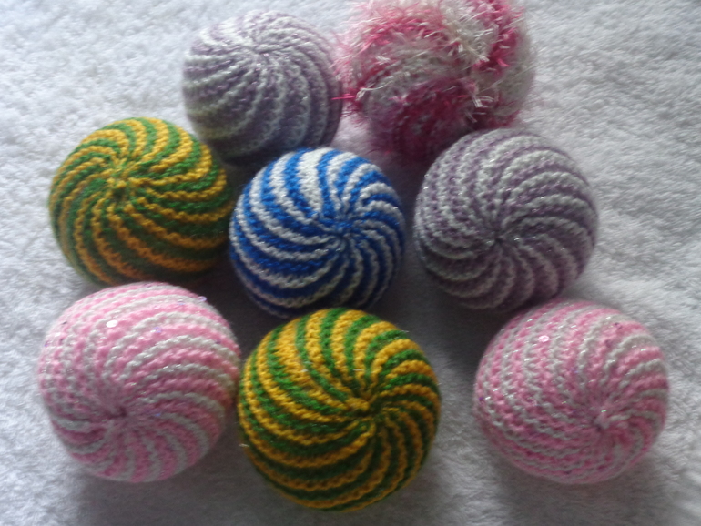 Связала спицами мячики,наполнила холофайбером.Лёгкие и мягкие.
