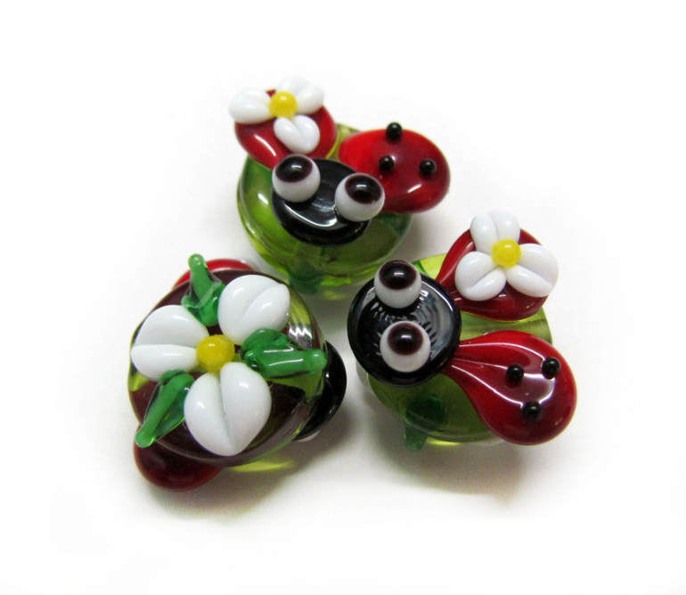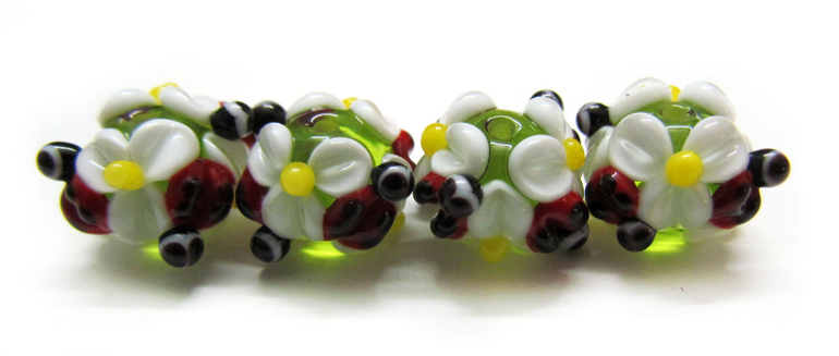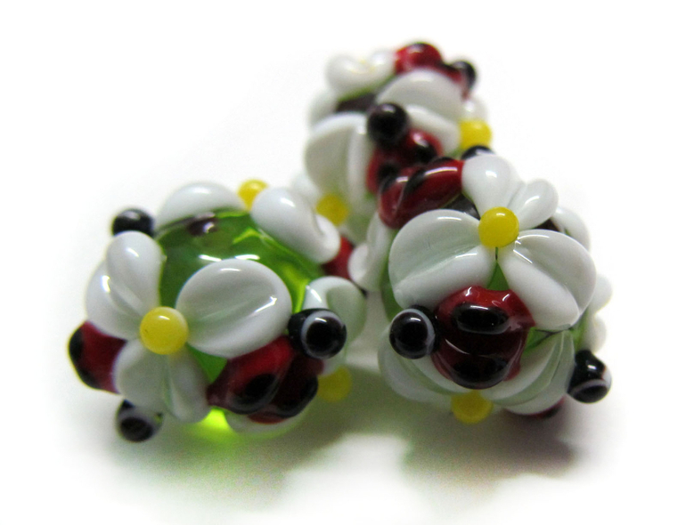 Бусины лэмпворк - цветочные шары с ромашками и божьими коровками. Приблизительный размер - 1 см х 1.5 см