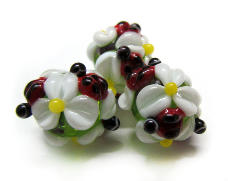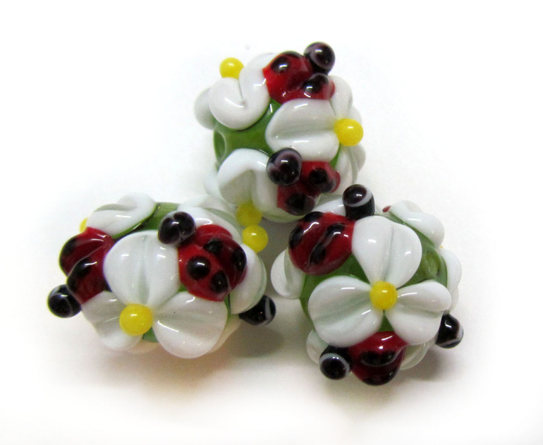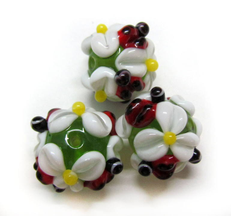 Бусины лэмпворк - цветочные шары с ромашками и божьими коровками. Приблизительный размер - 1.5 см х 2 см
