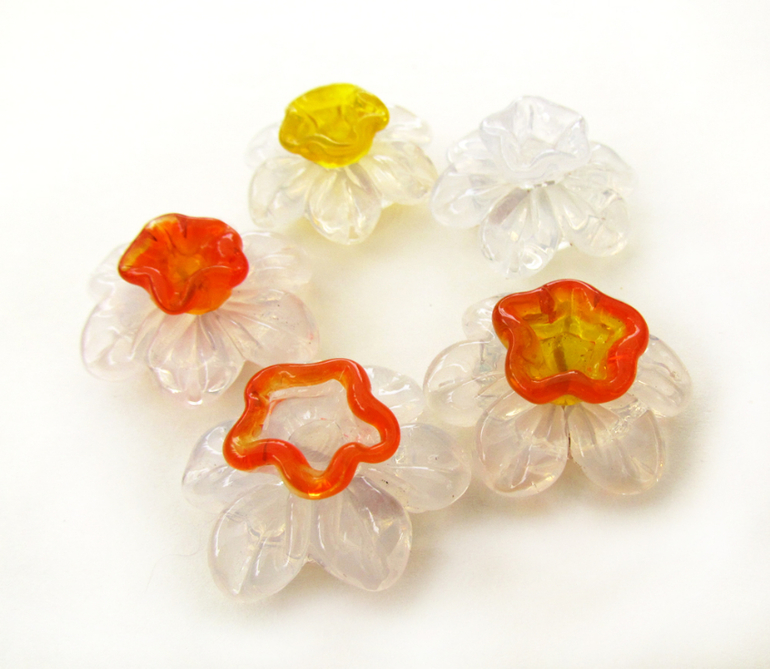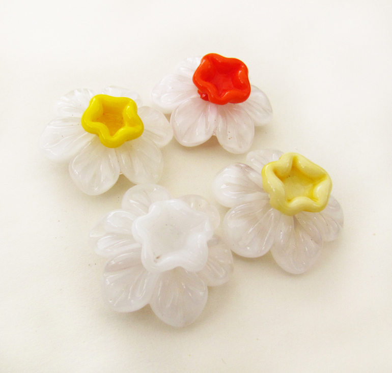 Стеклянные бусины нарциссы, выполненные в технике лэмпворк, для создания украшений.