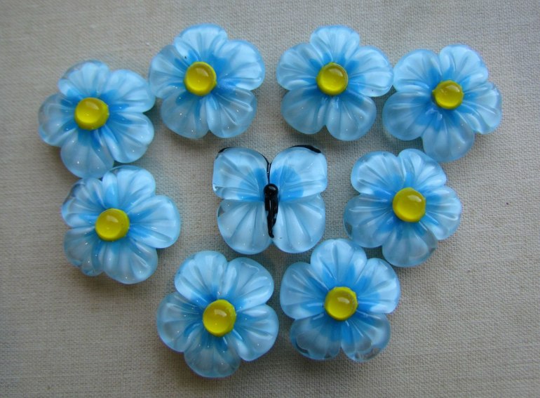 Цветочный набор бусин лэмпворк - голубые цветы и бабочка