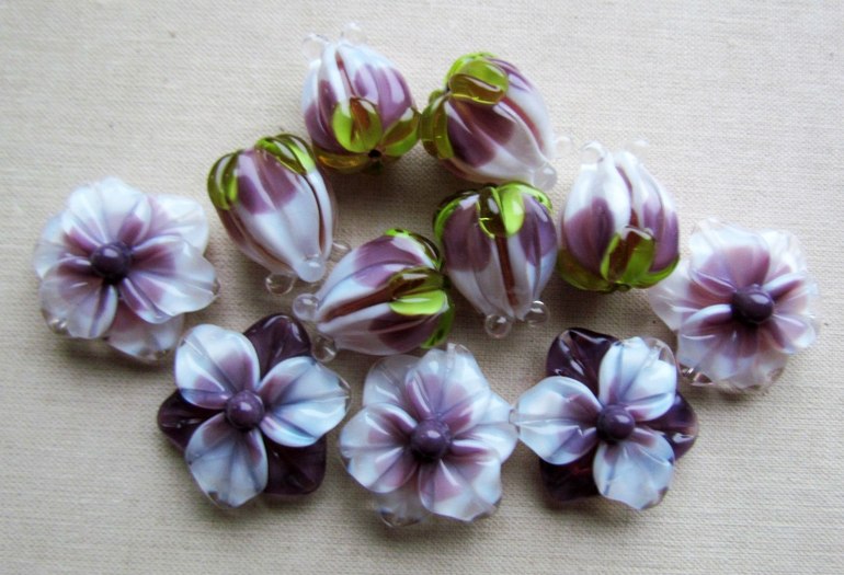 Бусины лэмпворк - цветы и бутоны, сделанные из аметистового и белого стекла