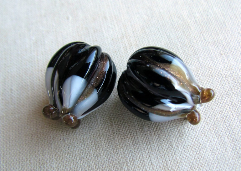 Набор цветов и бутонов лэмпворк, сделанных из черного и белого стекла с вкраплениями авантюрина