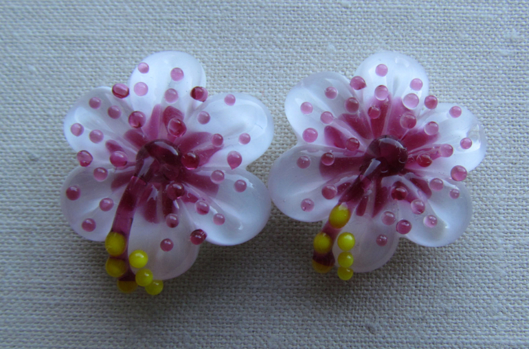 Бусины лэмпворк - гибискусы, сделанные из белого и малинового стекла