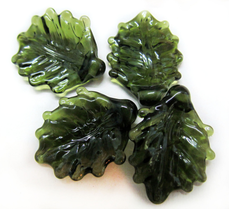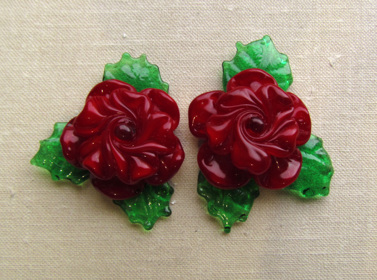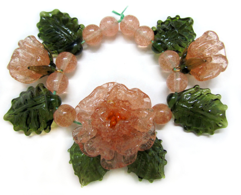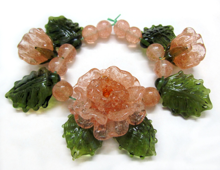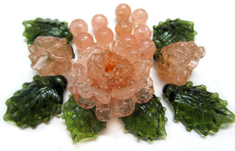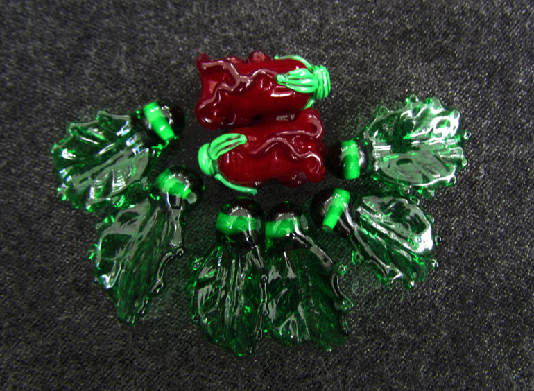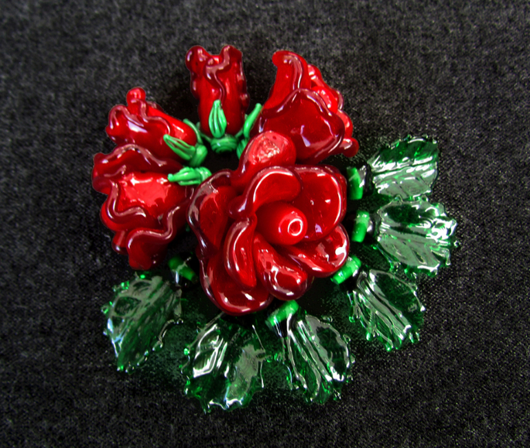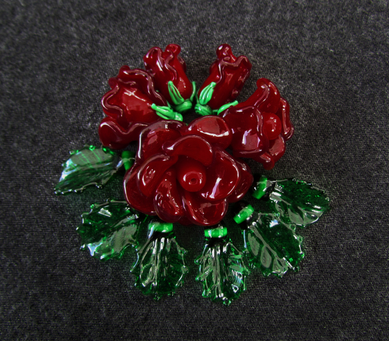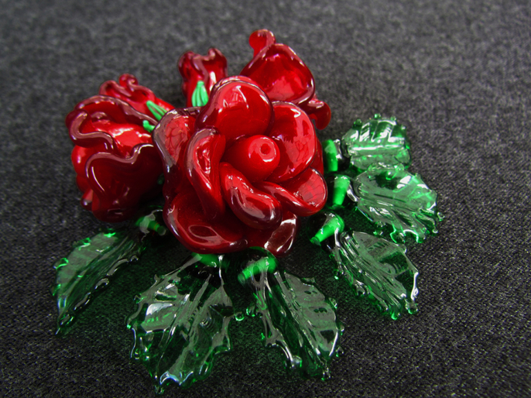 Набор из стеклянных роз, бутонов и листьев, выполненных в технике лэмпворк.