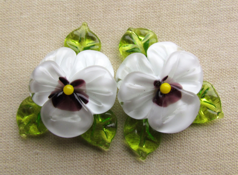 Бусины лэмпворк - анютины глазки. Лепестки из белого стекла, листики из светло-зеленого стекла.