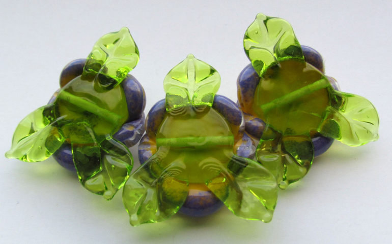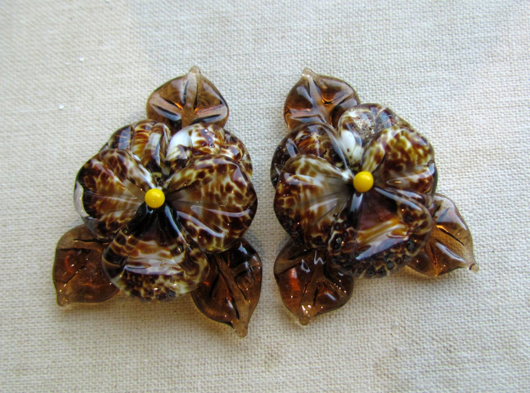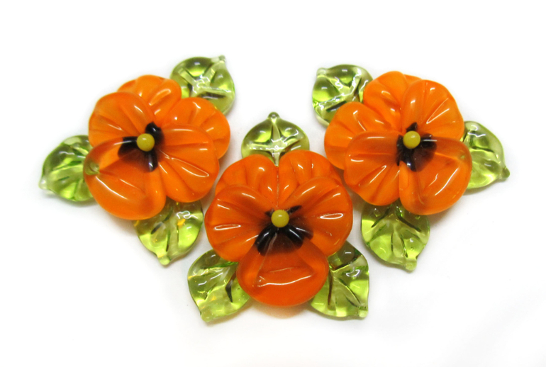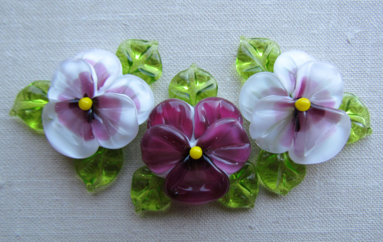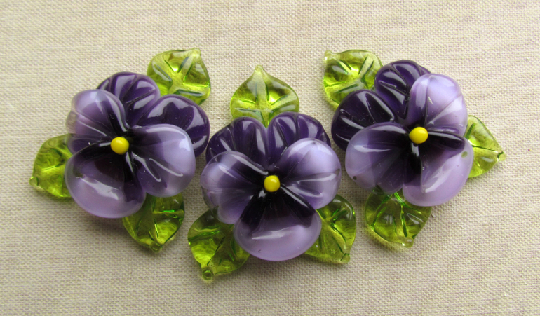 Бусины лэмпворк - анютины глазки. Лепестки из фиолетового и сиреневого стекла, листики из светло-зеленого стекла.