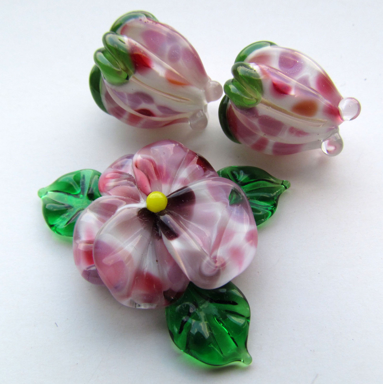 Набор бусин лэмпворк - фиалка и 2 бутона, выполненные из белого, малинового и темно-зеленого стекла
