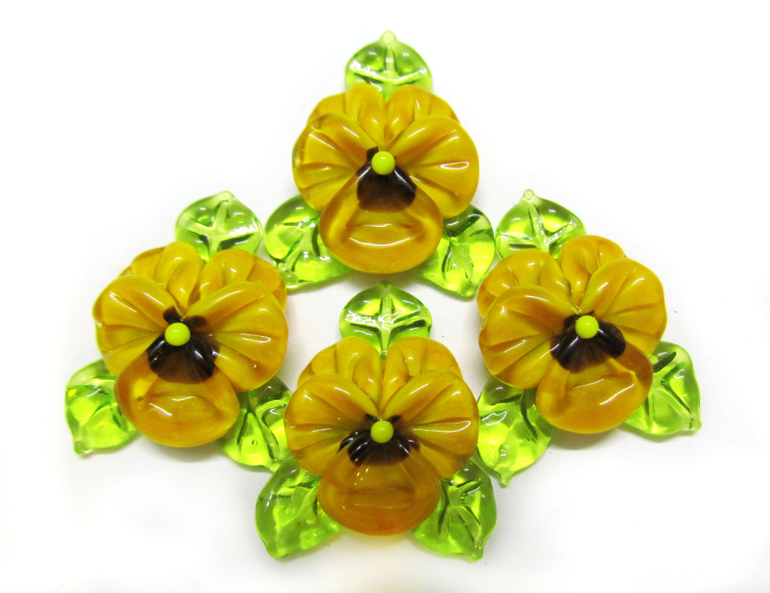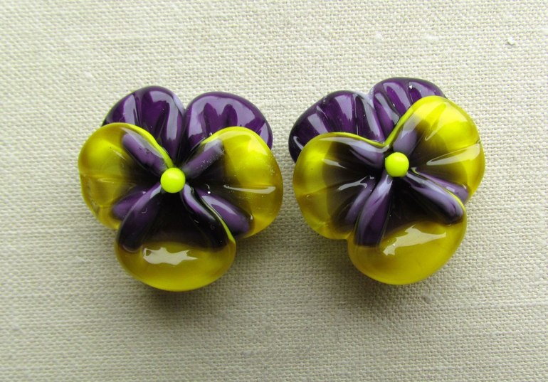 Бусины лэмпворк - желто-сиреневые анютины глазки