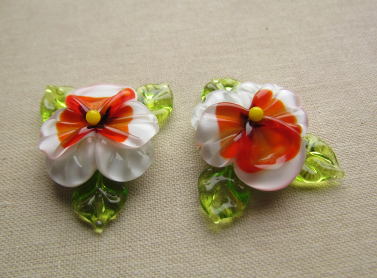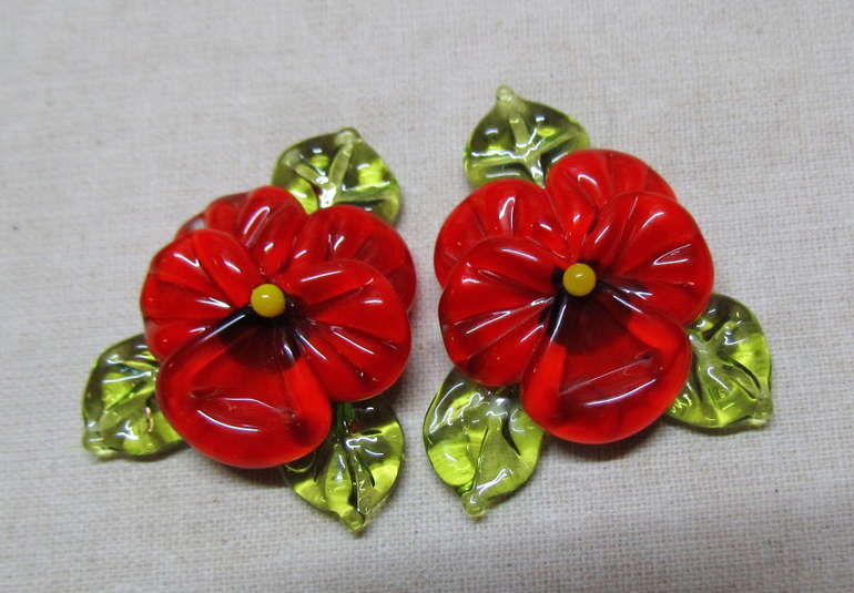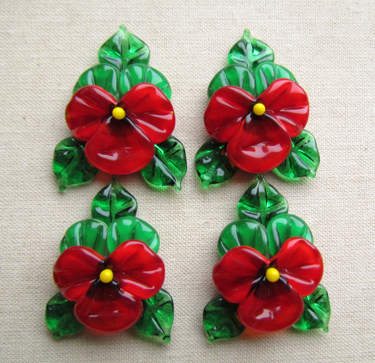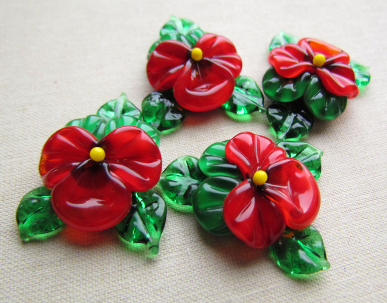 Бусины лэмпворк - анютины глазки. Лепестки из красного стекла, листики из стекла светло-зеленого цвета.