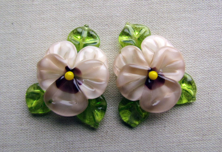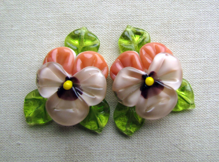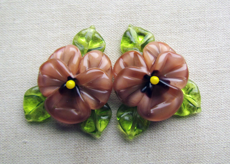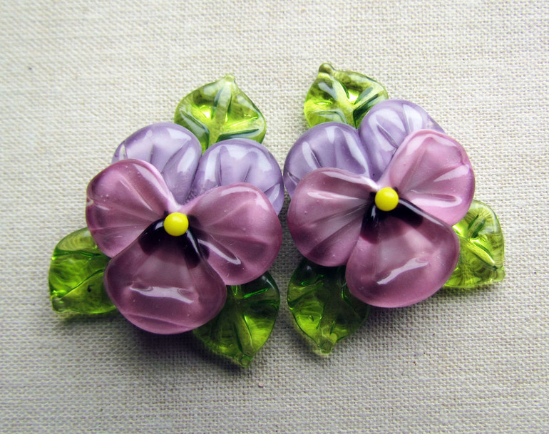 Бусины лэмпворк - анютины глазки. Лепестки из розового и сиреневого стекла, листики из светло-зеленого стекла