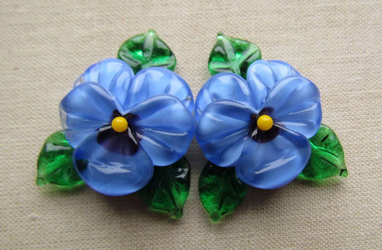 Бусины лэмпворк - анютины глазки. Лепестки из голубого стекла, листики из темно-зеленого стекла.