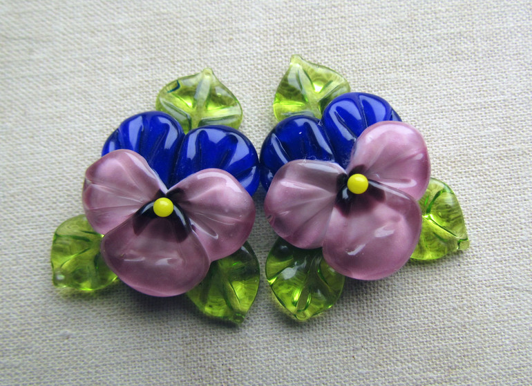 Бусины лэмпворк - анютины глазки. Лепестки из розового и синего стекла, листики из светло-зеленого стекла.