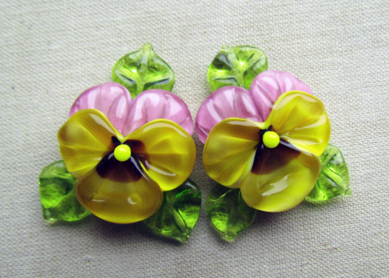 Бусины лэмпворк - анютины глазки. Лепестки из светло-розового стекла, листики из светло-зеленого стекла.