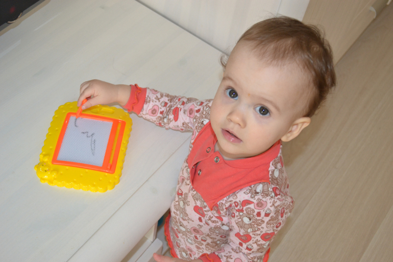Нравится рисовать на такой вот фигне, аккуратненько так держит пальчиками этот "маркер" и рисует, а потом стирает сама. Это приводит ее в восторг!)