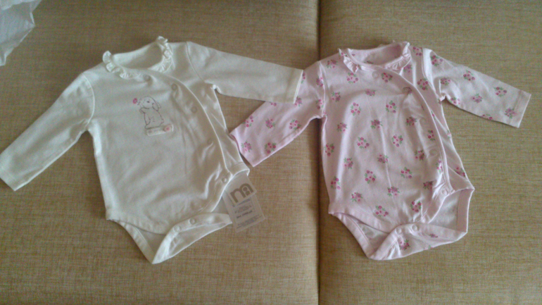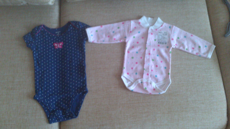 первые два бодика купила сегодня в mothercare, тащусь от них) фотки с телефона, не видно, что бежевенький бодик в розовый горошек, весь такой мимимишный))