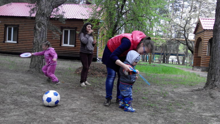 Было много общения и с детьми, и со взрослыми, и с природой. Из развлечений - катание с горки, игры с мячом, запускание бумерангов, игры в песке и немного воде(рыли туннель и запускали воду из озера),кормление страусов, поиски клада, приготовление обеда из лесных даров и бесконечная "покраска" водой домиков и всего вокруг настоящими кисточками (это был просто хит!!!)