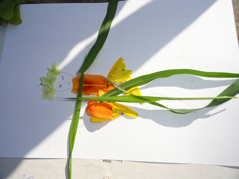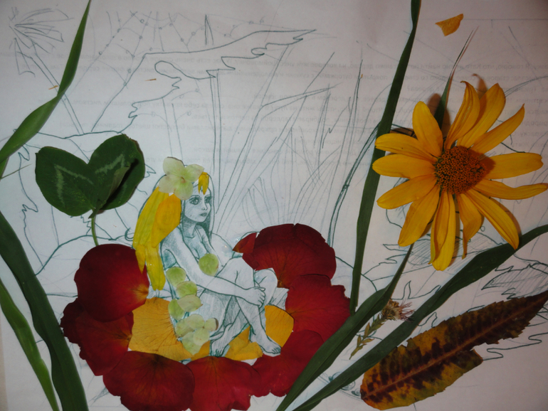 Делаем живую раскраску. Обычную распечатанную картинку со сказки украшаем и раскрашиваем природными материалами (лепестки цветов, травинки, пыльца, тычинки дают цвет). На улице Катя делать не захотела, так что я набрала цветов и травинок. кое-что уже у меня было высушенное. Но все равно Кати надолго не хватило - только на платье и цветок. И так, в основном клеем мазала, стараться не хотела. А вот мне очень понравилось. Позже еще предложу.