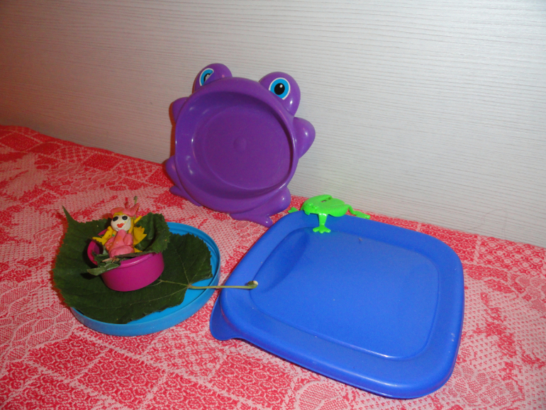 Там у нас были и лилии, и лягушки, и рыбки, и рак Чекибряк)))) В общем тут началось переплетение с историей Лунтика. И на вопрос, кто же кроме рыбок может помочь Дюймовочке. Катя ответила - Лунтик))) Он ведь может плавать под водой.