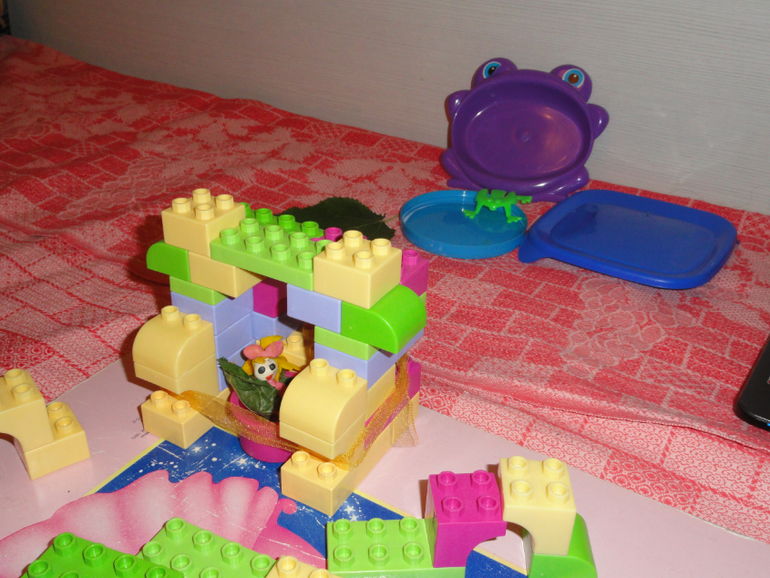 Как же еще ухаживала женщина за своей Дюймовочкой? Она любила её? Почему? Что еще можно сделать для девочки? Катя решила построить домик. Сделали (я в основном строила конечно, Катя украшала) домик с окошком!!!. За окошком пруд из синей крышки и лягушки.