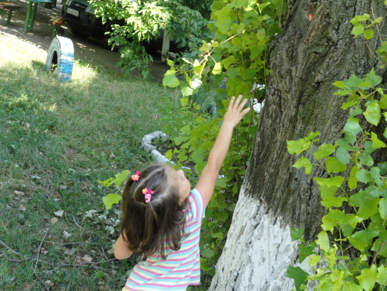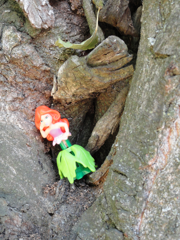 Возвращаемся в сказку. Я говорю, что Кате нужно найти по описанию дерево, на которое жук унес Дюймовочку. У нас есть старое дерево во дворе с причудливым стволом. Вот я его и описала: старое высокое дерево со стволом, покрытым сухими и молоденькими живыми веточками, листья в форме сердечка. Там в дупле сидела Дюймовочка.